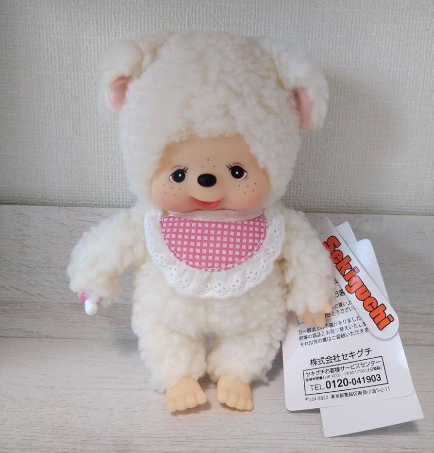 Una adorable y coleccionable figura de la marca Monchhichi (fabricada por Sekiguchi Corporation, Japón), en su versión ovejita (“Sheep”). Esta figura combina el diseño icónico de Monchhichi —con rostro y manos moldeados de vinilo/plástico y cuerpo de peluche suave— en un curioso y encantador de oveja. Ideal para fans del estilo kawaii, coleccionistas o como regalo especial para quien adora lo tierno con estilo japonés.